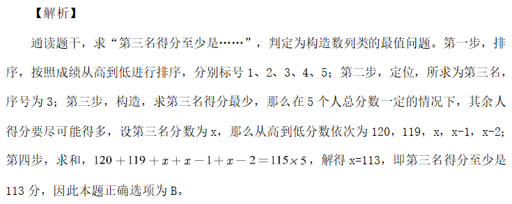 【例 3】在一次竞标中,评标小组对参加竞标的公司进行评分,满分 120 分。按得分排名,前 5 名的平均分为 115 分,且得分是互不相同的整数,则第三名得分至少是: